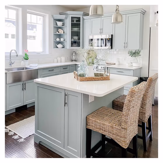 Want a stylish kitchen? View real-life photo examples of this fascinating cool hue is paired with backsplashes, countertops, and hardware.