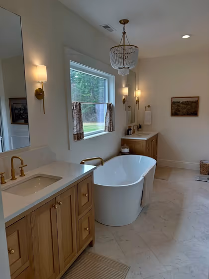 White Dove is that bathroom wall color when you want it to feel bright, but not icy. In these bathrooms, it plays so nicely with warm wood vanities, brass sconces, and soft stone/tile - everything looks a little more finished without trying hard. It's also super forgiving with white subway tile, because it doesn't go stark next to it. If your bathroom gets low natural light, White Dove keeps things creamy and calm instead of turning gray.