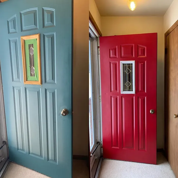 This color scheme is a combination of two shades that are opposite each other on the color wheel. The high contrast between these colors creates a vibrant and dynamic visual effect. For the color Crabby Apple with a red hue, complementary colors are those with a green hue close to 184, such as Sherwin Williams Mountain Air and Niebla Azul.