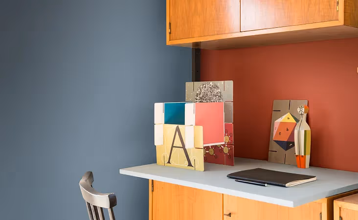This color scheme is a combination of two shades that are opposite each other on the color wheel. The high contrast between these colors creates a vibrant and dynamic visual effect. For the color Denim Drift with a green hue, complementary colors are those with a red hue close to 19, such as Dulux Cocoa Blush 5 and Chalk Blush 3.