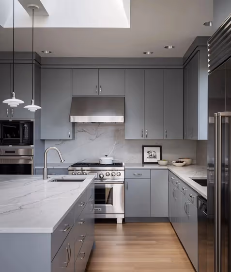 Want a stylish kitchen? View real-life photo examples of this fascinating cool hue is paired with backsplashes, countertops, and hardware.