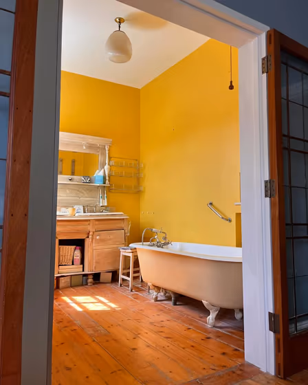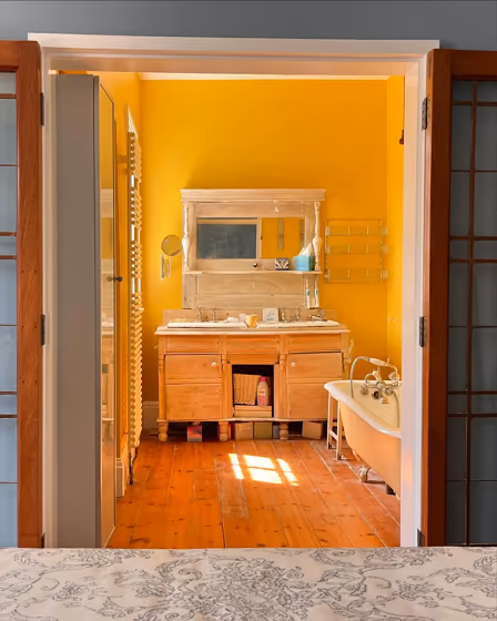 Let’s dive into a full Babouche paint color review. Take a look at pictures of real interiors and exteriors painted with beautiful 223. Find out if this gorgeous warm yellow paint color would look great on your living room walls or trims, kitchen cabinet, bedroom accent wall, bathroom or house exterior.