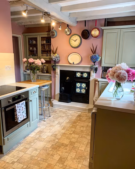 Farrow and Ball 246 on kitchen cabinets (3 photos)