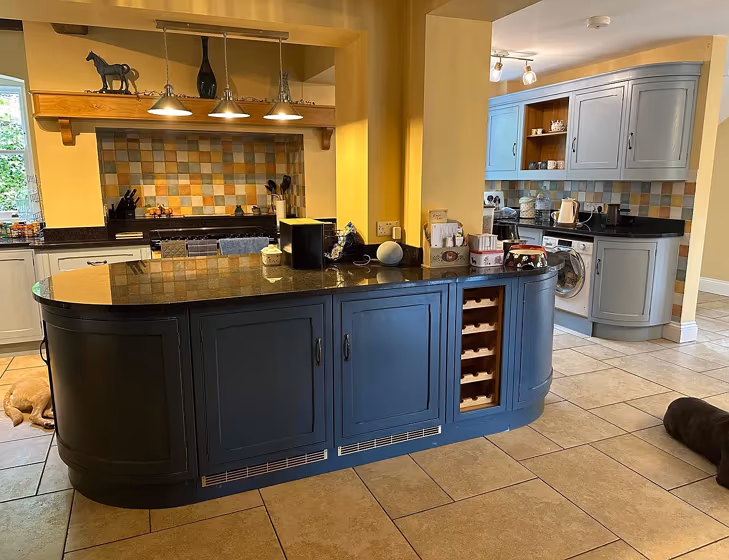 This color scheme is a combination of two shades that are opposite each other on the color wheel. The high contrast between these colors creates a vibrant and dynamic visual effect. For the color Dorset Cream with a orange hue, complementary colors are those with a blue hue close to 220, such as Farrow and Ball Cook's Blue.