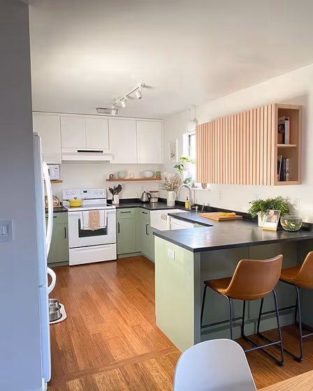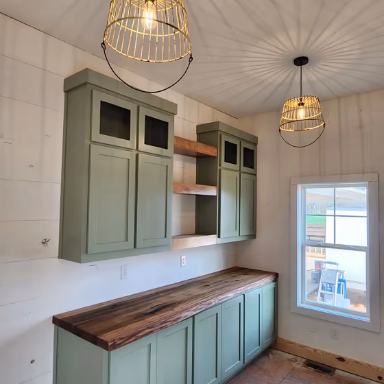 Sherwin Williams SW 9128 on kitchen cabinets (2 photos)