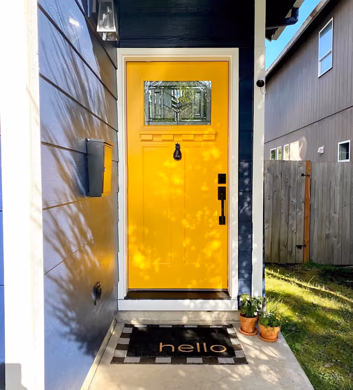 Looking for a fresh new look for your house exterior or starting from skretch? We’ve collected pictures of real-life homes that have been painted with this warm hue. Find inspiration for your house’s exterior, front doors, gates, shutters, frames or windows.