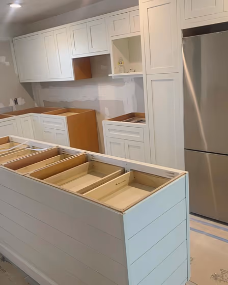 Sherwin Williams SW 7056 on kitchen cabinets (2 photos)