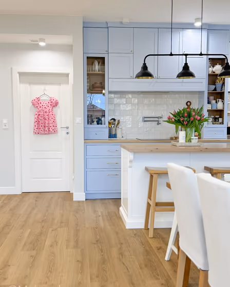 Want a stylish kitchen? View real-life photo examples of this fascinating cool hue is paired with backsplashes, countertops, and hardware.