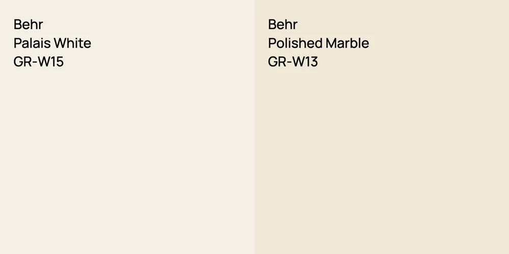 Despite their differences, both colors share a similar value, Behr GR-W15 radiating a lighter essence compared to GR-W13.