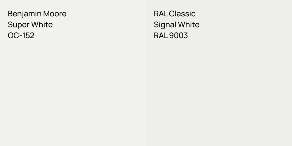 Benjamin Moore OC-152 and RAL 9003 differ significantly in saturation. Benjamin Moore OC-152 is more saturated.