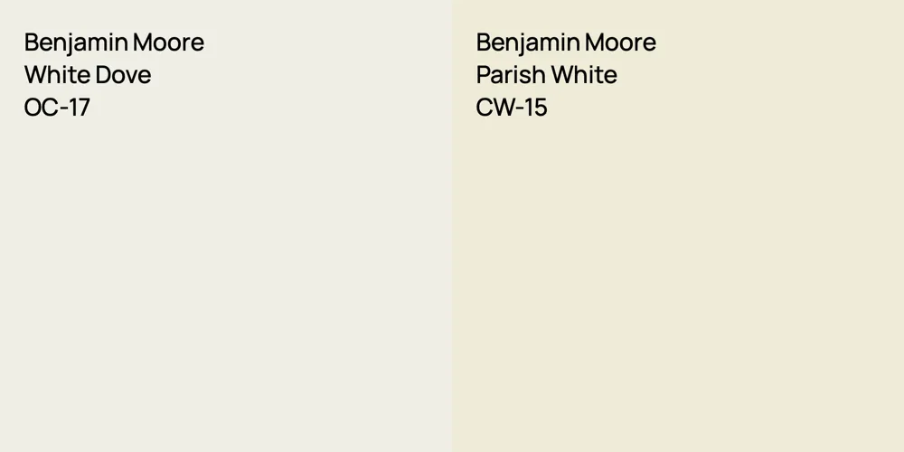 Despite their differences, both colors share a similar value, Benjamin Moore OC-17 radiating a lighter essence compared to CW-15.