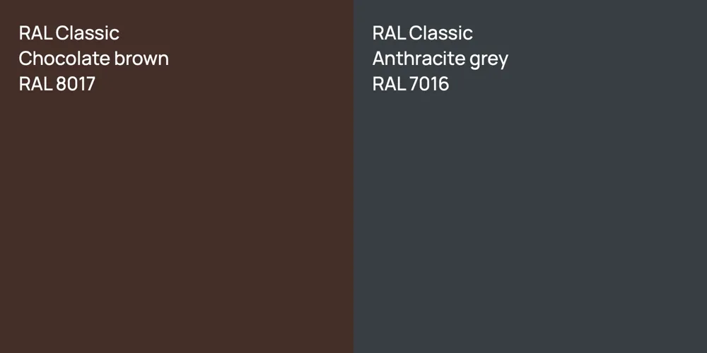 RAL Classic RAL 8017 and RAL 7016 differ significantly in saturation. RAL Classic RAL 8017 is more saturated.