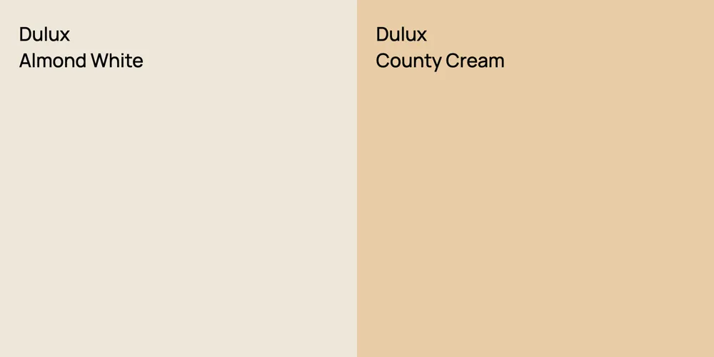 They differ in their values, Dulux Almond White radiating a lighter essence compared to County Cream.