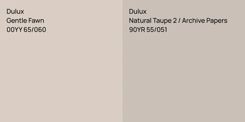 Despite their differences, both colors share a similar value, Dulux 00YY 65/060 radiating a lighter essence compared to 90YR 55/051.