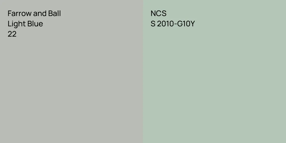 The colors, each unique in their hue and saturation, embody their own individual beauty and value. It's important to note that the colors have different hues. Farrow and Ball 22 leans towards hues, while NCS S 2010-G10Y is .