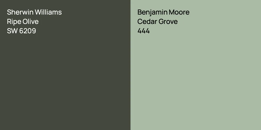 The colors, each unique in their hue and saturation, embody their own individual beauty and value. It's important to note that the colors have different hues. Sherwin Williams SW 6209 leans towards hues, while Benjamin Moore 444 is .