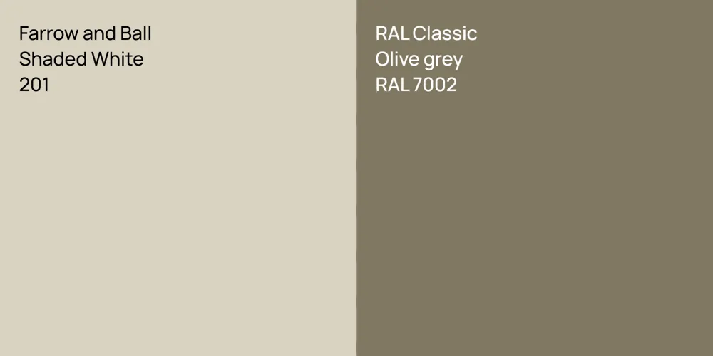 Farrow and Ball 201 and RAL 7002 differ significantly in saturation. Farrow and Ball 201 is more saturated.