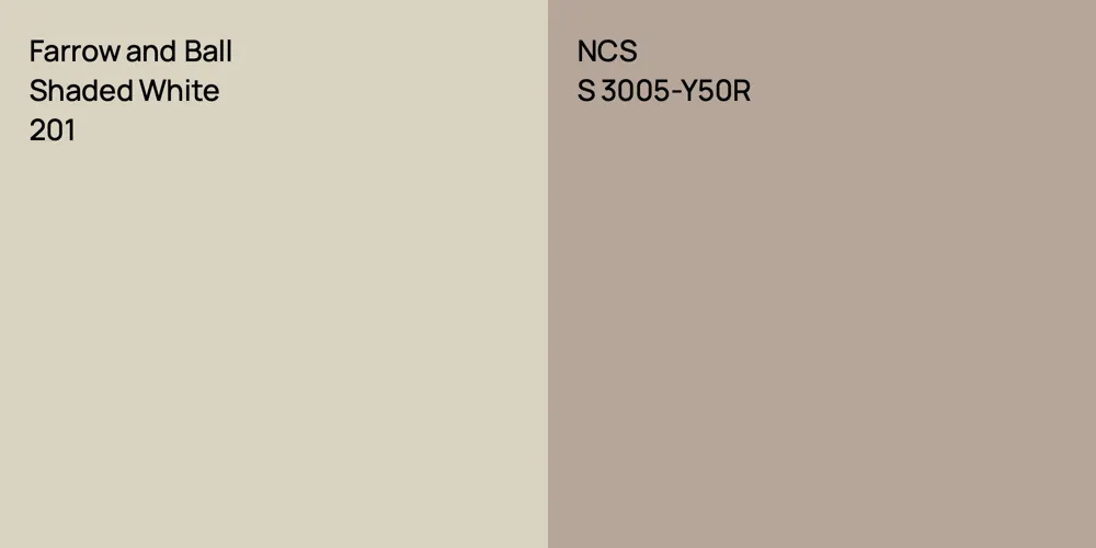 They differ in their values, Farrow and Ball 201 radiating a lighter essence compared to S 3005-Y50R.